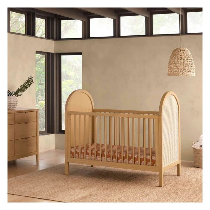 | In Depth | The Bondi 3-in-1 Convertible Crib celebrates boho-inspired design and natural materials with its warm wood tone, playfully arched side panels, and curved feet. The Bondi is designed to grow with your babe using an included toddler bed conversion rail and is screened for harmful chemical emissions to ensure it meets GREENGUARD GOLD Certification. |