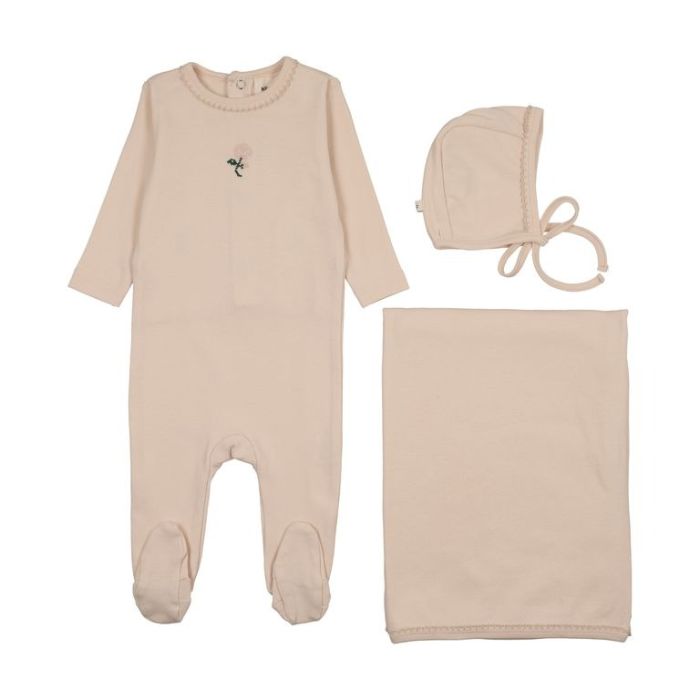 Mema Knits EMBROIDERED FOOTIE THREE PIECE SET Light Pink / Pale Pink Flower