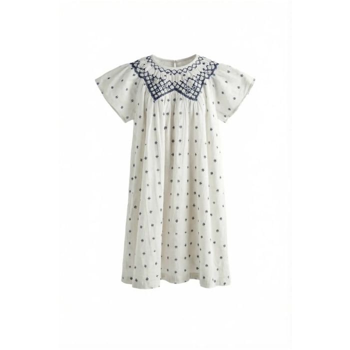 Pernille SMOCK STITCH EMBROIDERED FLOWERS DRESS Ivory/Blue
