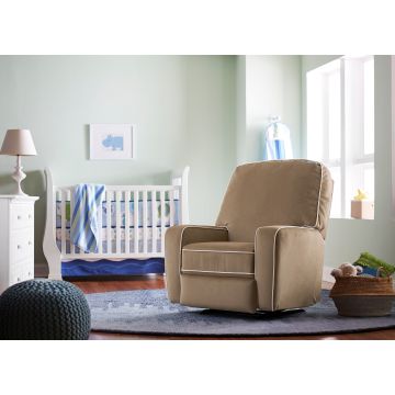 Cool and hip, today’s generation would call this chair tight. Literally speaking, this nursery swivel glider is just that. Tightly upholstered throughout the back, arms and side, the banded seat cushion is accented in cording and is reversible. A matching glide ottoman is available to make your nursery time with the little one sweet.
